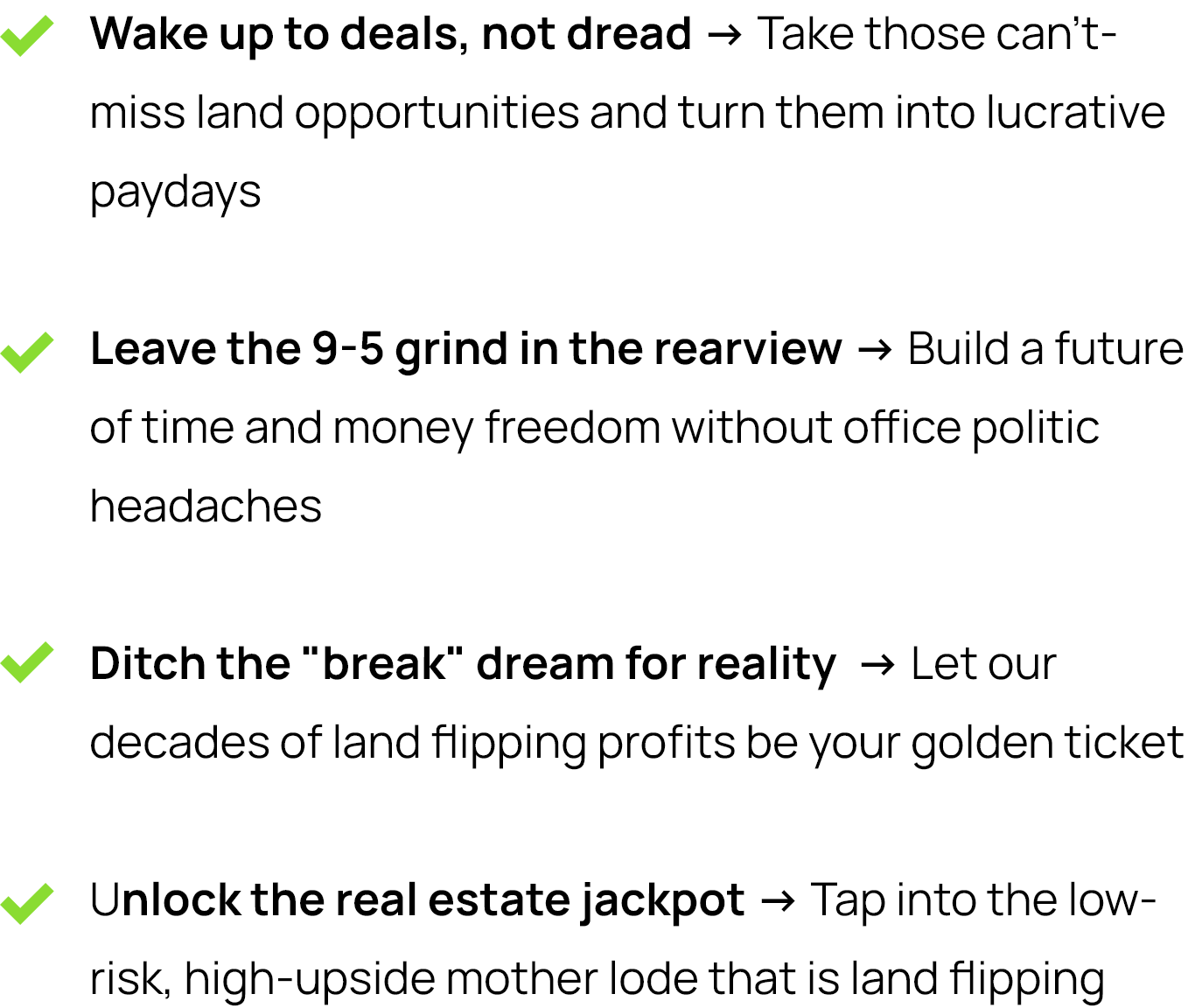 Our proprietary land flipping playbook will be your unfair advantage for locking down incredible raw land deals with little to no money out of pocket.
